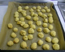 Aus dem Teig kleine Kugeln formen + auf einem mit Backpapier belegtem Backblech auf der mittleren Schiene bei 150°C ca 15-20 min backen.
