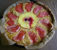 Rundherum die filetierte rote Pampelmusenscheiben legen, ein wenig in den Teig drücken.