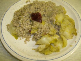 Auf ein Blatt Chicoree am Stielende ein Stück Seelachs legen, aufrollen, mit dem Ende nach unten auf den gekochten Buchweizen in der Auflauf-form legen + so fortführen bis der Buchweizen ganz bedeckt ist, dies dann auch mit der 2. Form + mit der 2. Scheibe Seelachsfilet tätigen.