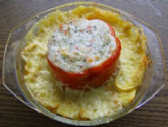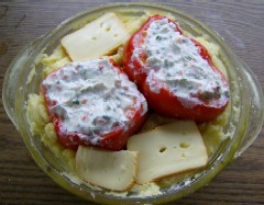 In die eingefetteten Schüsseln eine kleine Schicht Quetschkartoffeln ein-füllen, 1 oder 2 gefüllten Schoten reinstellen, drum rum, mit Kartoffelbrei ausfüllen, damit sie nicht umfallen, nicht bis zum Rand.