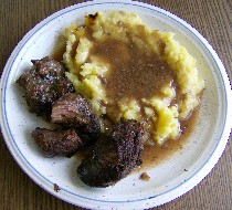 Habe es heute mal zur Abwechslung, nach dem einlegen, die Keule in Gänsefett scharf angebraten, dann mit der Einlegeflüssigkeit und ca 2 cm hoch im Topf abgelöscht, Deckel drauf, gut 90 min bei 180°C Ober- + Unterhitze braten lassen, dazu gab es Kartoffelpüree aus Pellkartoffeln..
