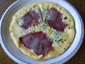 Feta mit den Eiern pürieren, ins heiße Fett gießen, 2 El Kräuter drüber verteilen etwas stocken lassen die Eier, den Landschinken drauf legen,
