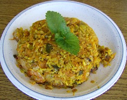 In 2 Tassen kochendem Wasser 0,5 Tl Kurkuma + nach dessen wiederhol-ten aufkochen, 1 Tasse gespülten Naturreis zugeben, wiederum aufko-chen, die Hitze kleinstellen, und ca 35 min kochen, und ca 10 min ausquellen lassen.