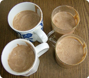 Honig, Mandeln, Milch, Kakao , Gewürze + Rosinen unter den Mehlbrei rühren.