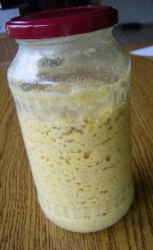 kohlensäurehaltiges Mineralwasser zusammen verrühren, muss eine di-cke Pampe werden, in 1 Schraubglas (720 ml), Deckel drauf, warm stel-len, Zimmertemperatur ( über Nacht im Schrank z.B )