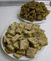 in Streifen, Rechtecke oder Rauten schneiden, oder evtl mit einem runden Glas ausstechen, Plätzchen bis zum vollen erkalten auf den Blechen las-sen, und sie dann vorsichtig abheben.