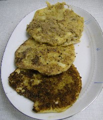Als Panade eignet sich auch Sesamsaat, Nüsse aller Art, Solo und oder mit Mehl gemischt.