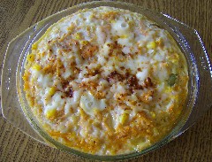 Möhren + Reis, sowie Oliven + Maiskörner + Feta mischen + in ausgefet-tete Jenaschüsseln verteilen. Vier 0,5 l Jenaschüsseln oder besser noch 0,75 l.