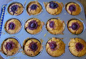 die Mulden im Muffeinsblech gut ein bzw ausfetten, mit einer Schöpfkelle den Teig verteilen,