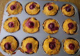Esslöffelweise in die ein- ausgefetteten Muffinsmulden geben, mit einem Esslöffelrücken, diesen immer wieder in kaltem Wasser tauchen, die Teigmasse glattstreichen, in jede Muffinsteig, nun noch 1 TK Kirsche drü-cken.