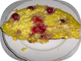 in eine 24 cm mit Backpapier ausgefüllte Bratpfanne gießen, außen rum, ca 9 TK Kirschen in den Auflauf drücken, in die freie Mitte noch die Prei-selbeeren, Deckel schließen, auf eine kalte Kochplatte stellen, auf Stufe zwei von sechs möglichen Stufen ca 50 - 60 min langsam backen,