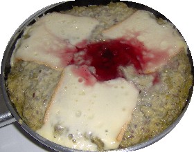 Dose grüne Bohnen abseihen und vorsichtig unterheben, alles in eine 20 cm eingefettete 20 cm Bratpfanne gießen, glattstreichen, drei Scheiben Raclette Käse verteilen und in die Mitte einen Tl Preiselbeeren a d Glas geben, Deckel schließen, auf eine kalte Kochplatte stellen, Hitze auf Stufe zwei von sechs möglichen Stufen langsam 60 – 75 min backen, die Teig-oberfläche sollte nicht mehr glänzen, der Auflauf sollte sich beim schütteln vom Pfannenboden lösen.