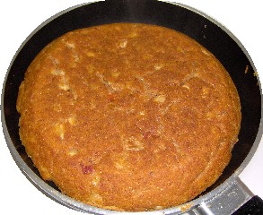 mit den Tomaten verrühren, trockne Zutaten vermischen und dazu geben, verrühren, in die eingefettete Bratpfanne geben, glattstreichen, Deckel schließen, auf eine kalte Kochplatte stellen, auf Stufe zwei von sechs mög-lichen Stufen ca 50 min, eine gleichgroße Bratpfanne rauflegen, umdre-hen, die oberste entfernen, und nochmals 10-20 min backen, heiß servie-ren.