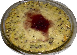 Ca 10 min auf der ausgeschalteten Kochplatte quellen lassen, in diesen Brei nun das angetaute Suppengemüse, Zucker u Salz, Sonnenblumen-kerne, Leinensaat u Paprikagranulat ein – bzw verrühren, 100 g Gauda unterrühren und in drei eingefettete Auflaufformen verteilen, obendrauf noch ein wenig Gauda raspeln, und mit einem Tl Preiselbeeren a d Glas in der Mitte verzieren. Deckel schließen,