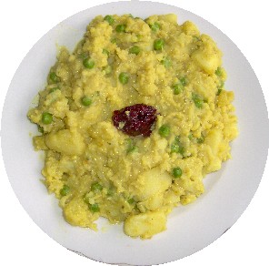 Butter in einen Topf erhitzen, Zwiebel u Ingwer und Curry u Gemüsebrühe darin anbraten, Blumenkohl kurz mit braten, Milch und Wasser gemischt abschrecken und ca 15 min garen mit geschlossenen Deckel, dann die TK Erbsen sowie die gewürfelten Kartoffeln dazu auch noch 3 min bei offnen Topf kochen, damit die Flüssigkeit ein wenig einkocht, Hitze ausstellen nun die gequetschte Kartoffel beifügen, ein wenig rühren und schon ist das ganze gut gebunden.