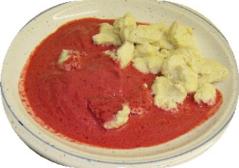 Mit Teelöffeln Klößchen abstechen. Die Klöße in leicht kochendem Salz-wasser 8 Minuten ziehen lassen, dann mit Erdbeersoße servieren.