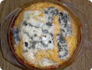 in zwei ausgefettete Auflaufformen die Teigmasse verteilen, glatt strei-chen, auf die eine Form den in Scheiben geschnittenen 80 g Gorgonzola