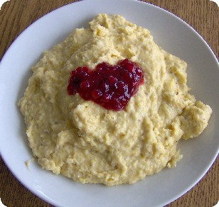 Topf von der Hitze, gekochte Hirse und geraspelten Gauda zugeben, ver-rühren, abschmecken mit 1 Tl Salz, die Suppe dickt sehr schnell nach, zur Not noch heiße Milch beifügen, heiß, mit Preiselbeeren in der Mitte, servie-ren.