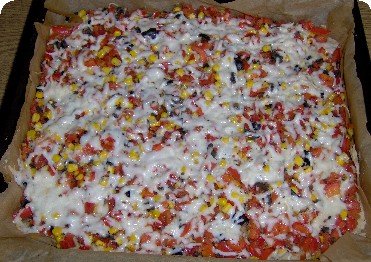 schwarze Oliven klein hacken, Dose Mais, dazu geben und mit wilden Ore-gano und Basilikum bestreuen, Zucker u Salz u gemörserten Pfeffer dazu, alles ein wenig vermischen, auf den vorgebackenen Teigboden verteilen, darüber nun noch den geraspelten Ziegenkäse, in den noch heißen Back-ofen geben, mit dem umgedrehten Backblech abdecken, wichtig, ohne diesem Blech wird der Ziegenkäse hart und trocken, bei 160°C Heißluft noch ca 30 min backen.