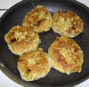 Bratlinge mit nassen Händen formen, im heißen Öl, bei reduzierter Hitze von beiden Seiten braten.