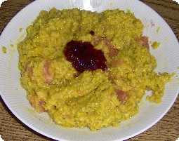 geschnittene Zwiebel anbraten in einem heißen Kochtopf, mit Mädchen-traube ablöschen, bis auf Salz und die Pampelmuse dazu, nun soviel Wein draufgeben dass die Erbsen gut 3 cm bedeckt sind, aufkochen und zuge-deckt bei kleiner Hitze ca 60 min kochen lassen, salzen alles grob pürie-ren, weiteren Wein zugießen, soll sämig werden, sowie kleingeschnittene Pampelmuse unterheben, ein wenig erhitzen, nicht mehr kochen lassen,