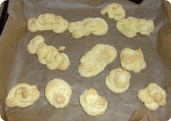 kleine Windbeutel in genügenden Abstand von einander auf das Backpa-pier (Backblech) spritzen.