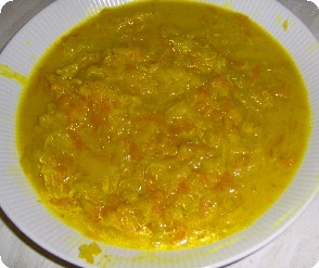Kohlrabi, Möhren, Kartoffeln und Zwiebel schälen und mit einer Gemüse-raspel einer Küchenmaschine grob raspeln lassen, in einen passenden Kochtopf geben, Kokosnussmilch und Wasser gut vermischen übers Ge-müse gießen und ca 10 min leise köcheln lassen, gemahlenen Gelbwurz, Salz sowie Zucker, unterrühren, abschmecken, evtl nachwürzen, und heiß in tiefe Suppenteller servieren.