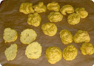 das Wasser mit Butter, Salz + Rum, zum kochen bringen, Hitze auf die Hälfte reduzieren, Kichererbsen auf ein mal in die Flüssigkeit schütten, rühren, bis sich ein Klumpen bildet und am Boden des Topfes eine feine weiße Schicht bildet, aber nicht anbrennen lassen, in eine Schüssel schüt-ten, ein wenig abkühlen lassen, nun die Eier einzeln dazu und verrühren, (nahm eine Küchenmaschine) nach dem 4. Ei ist es eine „dicke“ Pampe, bitte keine weiteren Eier dazu, der Teig läuft sonst beim backen, weg. Noch das Backpulver zugeben, mit verrühren lassen.
