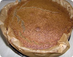 Ca 5 min verfestigen lassen, oben auf den Kuchen ein 2. Boden legen, festhalten, umdrehen, wird Saft entweichen, Vorsichtig Backpapier entfer-nen, die Ringform wieder ran, und ganz auskühlen lassen, Hirse braucht danach noch einige Stunden um sich zu verfestigen.